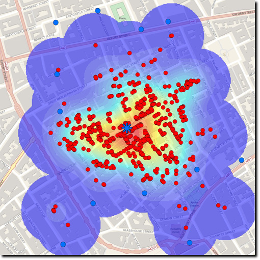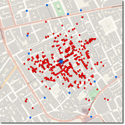 I must admit that I have sometimes neglected to mention John Snow and his work in my introductory GIS course (for shame!), so now I have some actual GIS data and a modern map to show in class. It may also turn into a good opportunity to introduce web mapping as well. After I saw Michael Gould’s original tweet, he and I discussed how we had both been meaning to find the replica Broad Street pump in London (tip: the street is now called Broadwick). Naturally, Mike tweeted a link to an ArcGIS Explorer map of pump locations which of course inspired me to put my version of the pump and death locations on there as well: