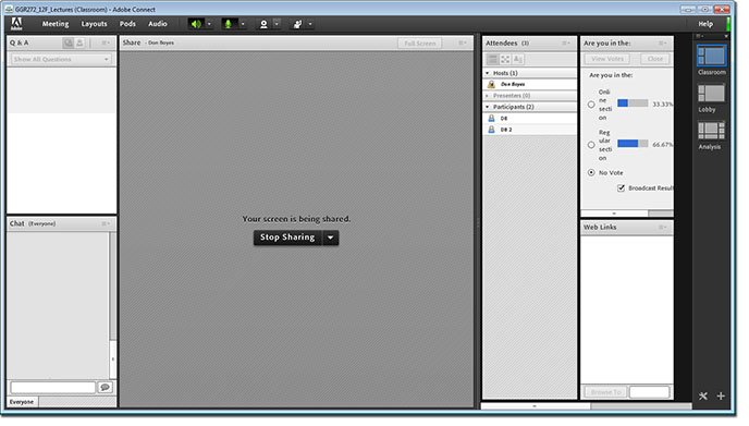 I’m currently teaching two sections of the same introductory GIS course, one face-to-face (F2F), and one online. This morning I tried a little experiment – I taught my regular F2F class in a lecture hall as usual, but I had a live webinar version of it online at the same time. It went remarkably well, so I thought I would briefly explain what I did, why, and how.