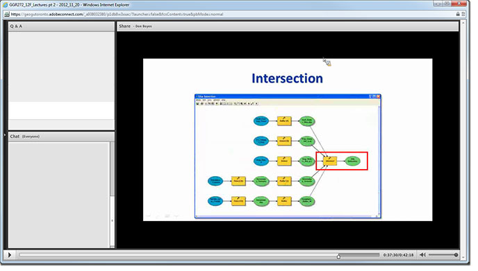 Students that did not attend the live lecture (in either section of the course) could see whatever I showed using the projector in class, which included PowerPoint slides, web pages, and a live demo of ArcGIS ModelBuilder. They could hear me talking, but could not see me (no separate video feed of the instructor). Besides this main window, there were two smaller windows, one for questions, and one for chat (these were not visible to the F2F students). I recorded the entire two-hour lecture, broken into two parts, that was then posted online for students who couldn’t watch live, as well as for those who may want to refer to it again later. The students who attended the webinar version were from both sections of the course (I did a quick poll before class started).